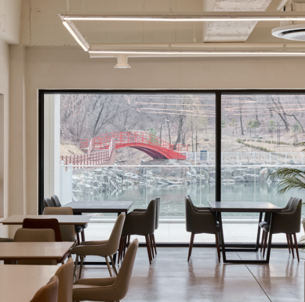 통창을 통해 자작나무숲의 풍경을 바라보며 식사할 수 있어요. 특히 봄과 가을에는 창가 자리를 예약하는 것이 좋습니다. 주말에는 사람이 많으니 예약은 필수!