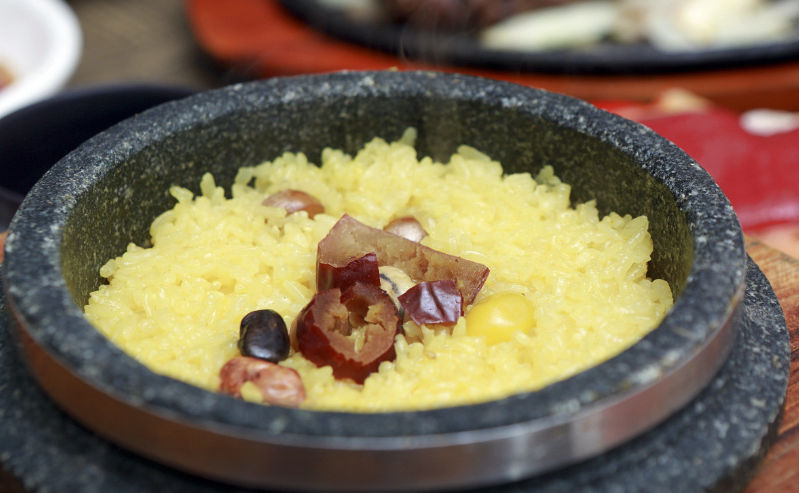 - 약초와 견과류가 들어간 건강한 돌솥밥과 반찬